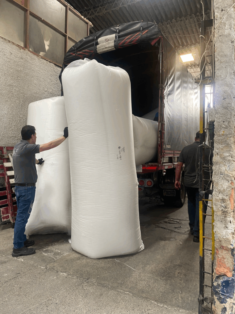 En Guatas & Fibras de Colombia S.A.S. garantizamos un proceso logístico eficiente que asegura la entrega oportuna de nuestros productos en cualquier región del país. Cada rollo de guata es cuidadosamente embalado y transportado para preservar su forma y calidad durante el envío. Nuestro compromiso es brindar a cada cliente cumplimiento, confianza y un servicio ágil, desde la fábrica hasta su destino final.